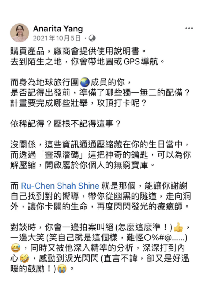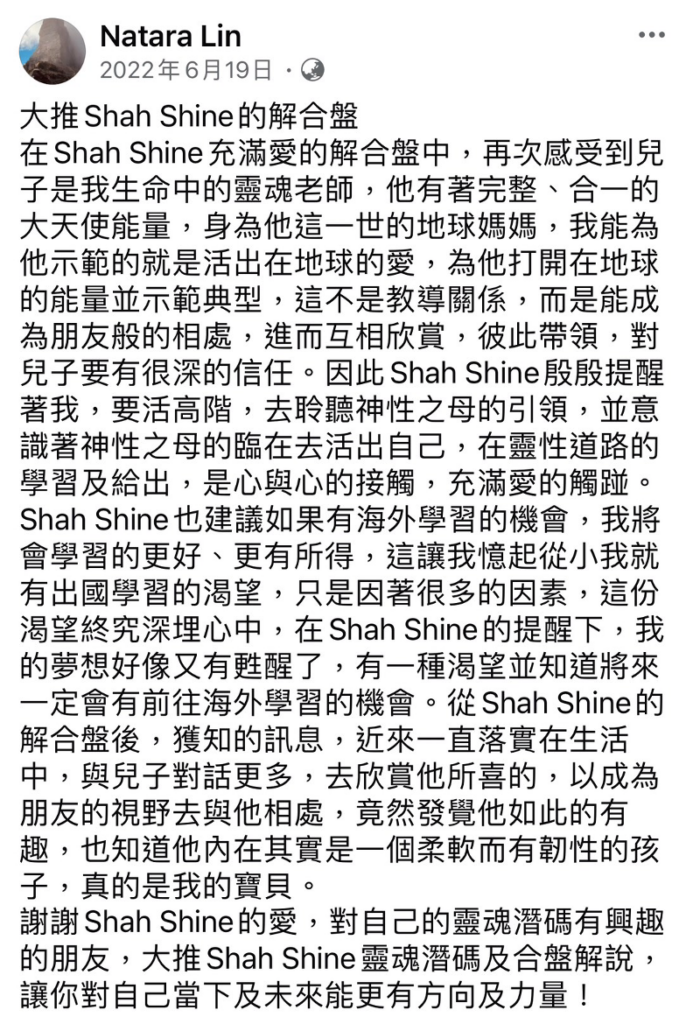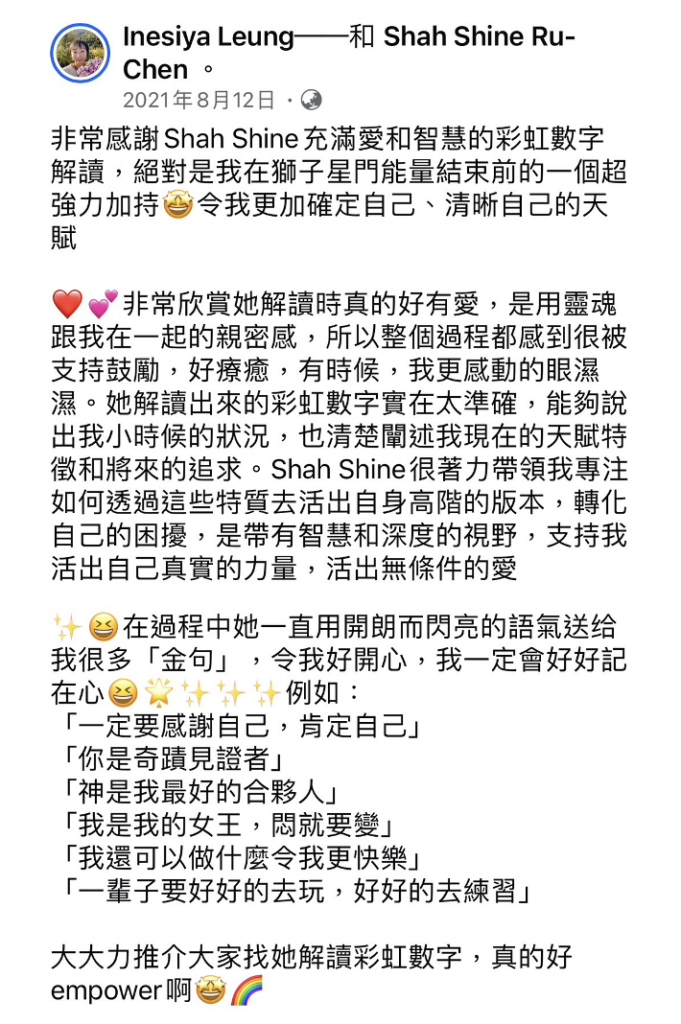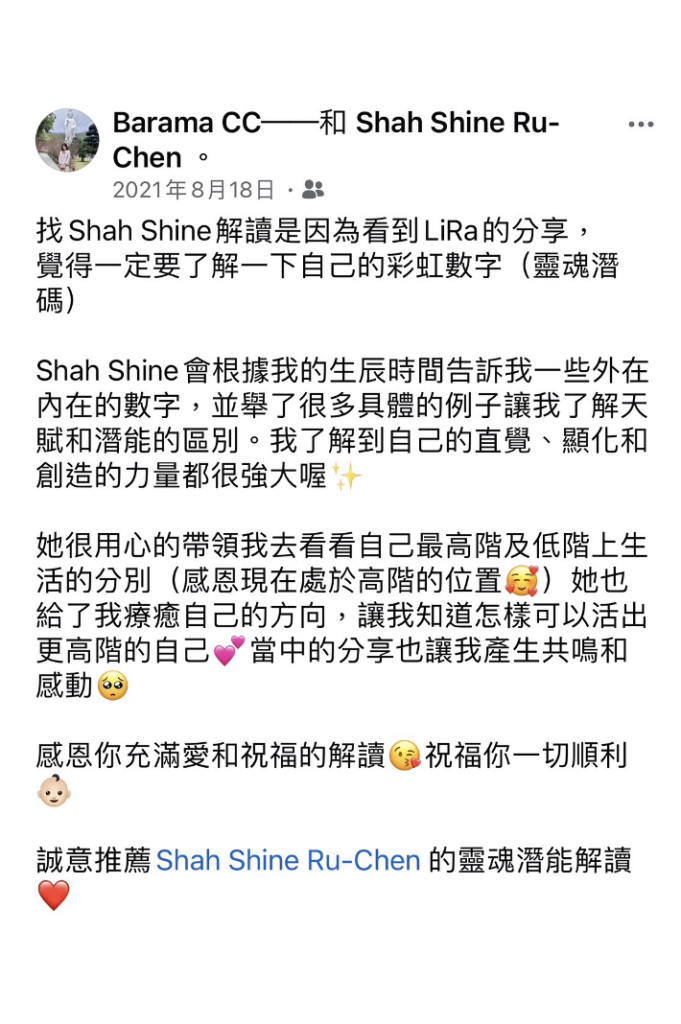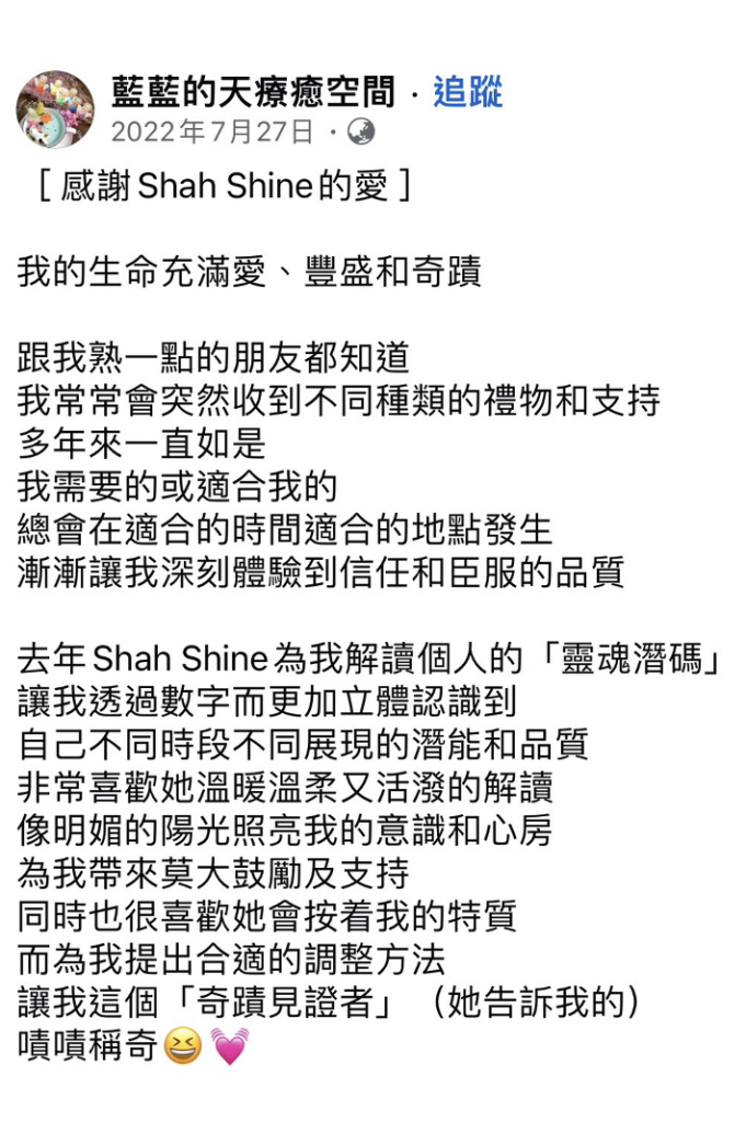 Shah Shine 珍惜每一次與準備迎接改變的人同行的機會,透過陪伴與指引,一同探索生命的無限可能,共創奇蹟與轉變。相信每個靈魂都擁有獨特的光芒,當我們接納自己的全部,展現天賦並實現潛能,內心將越加滿足,世界也將更加美好豐富。